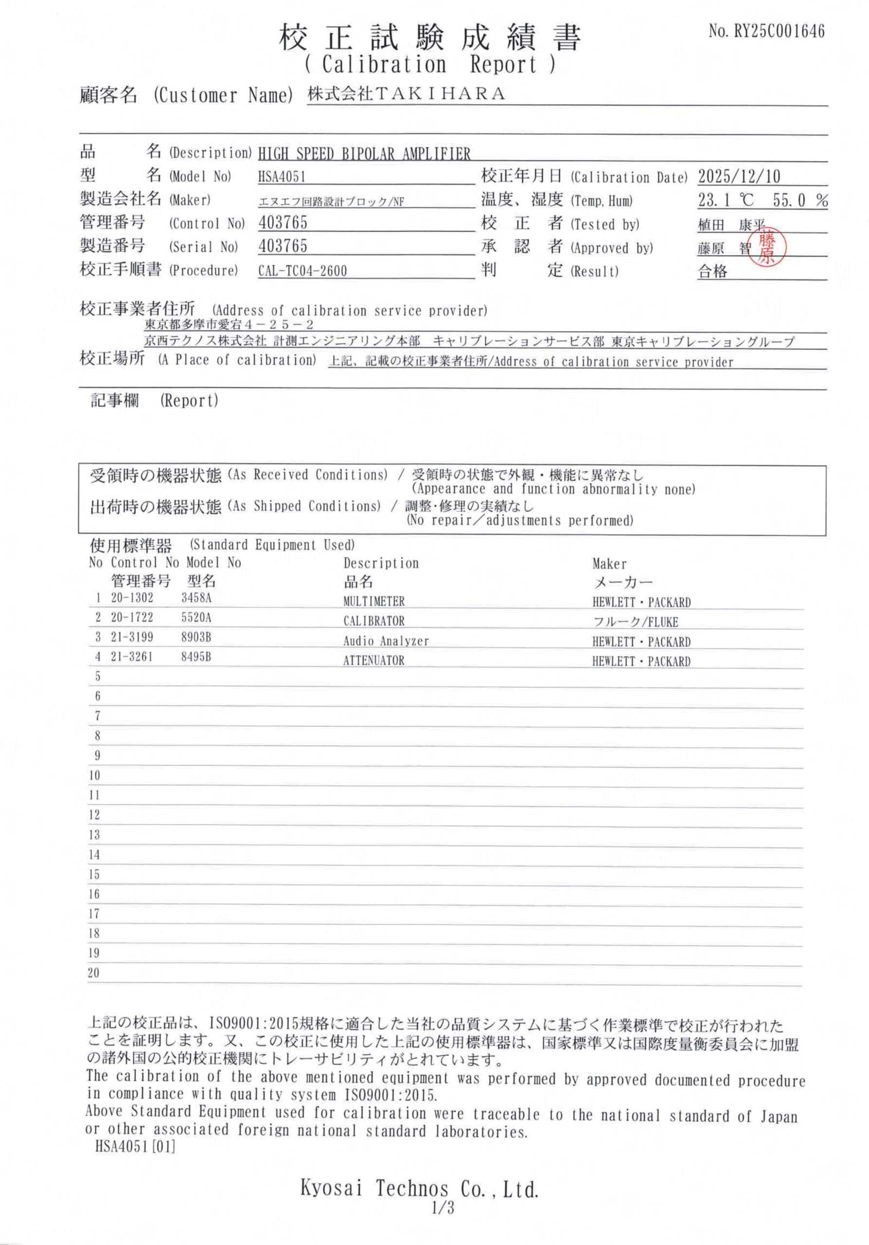 Accessories: Calibration Test Report