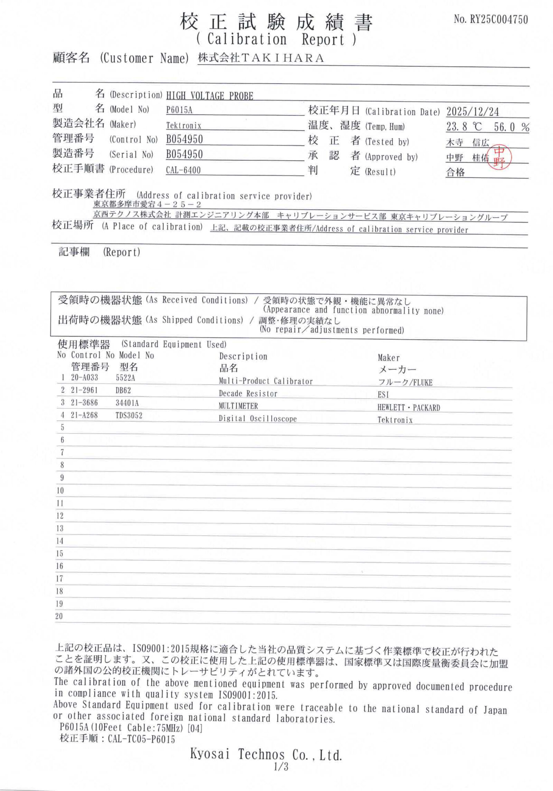 Accessories: Calibration Test Report