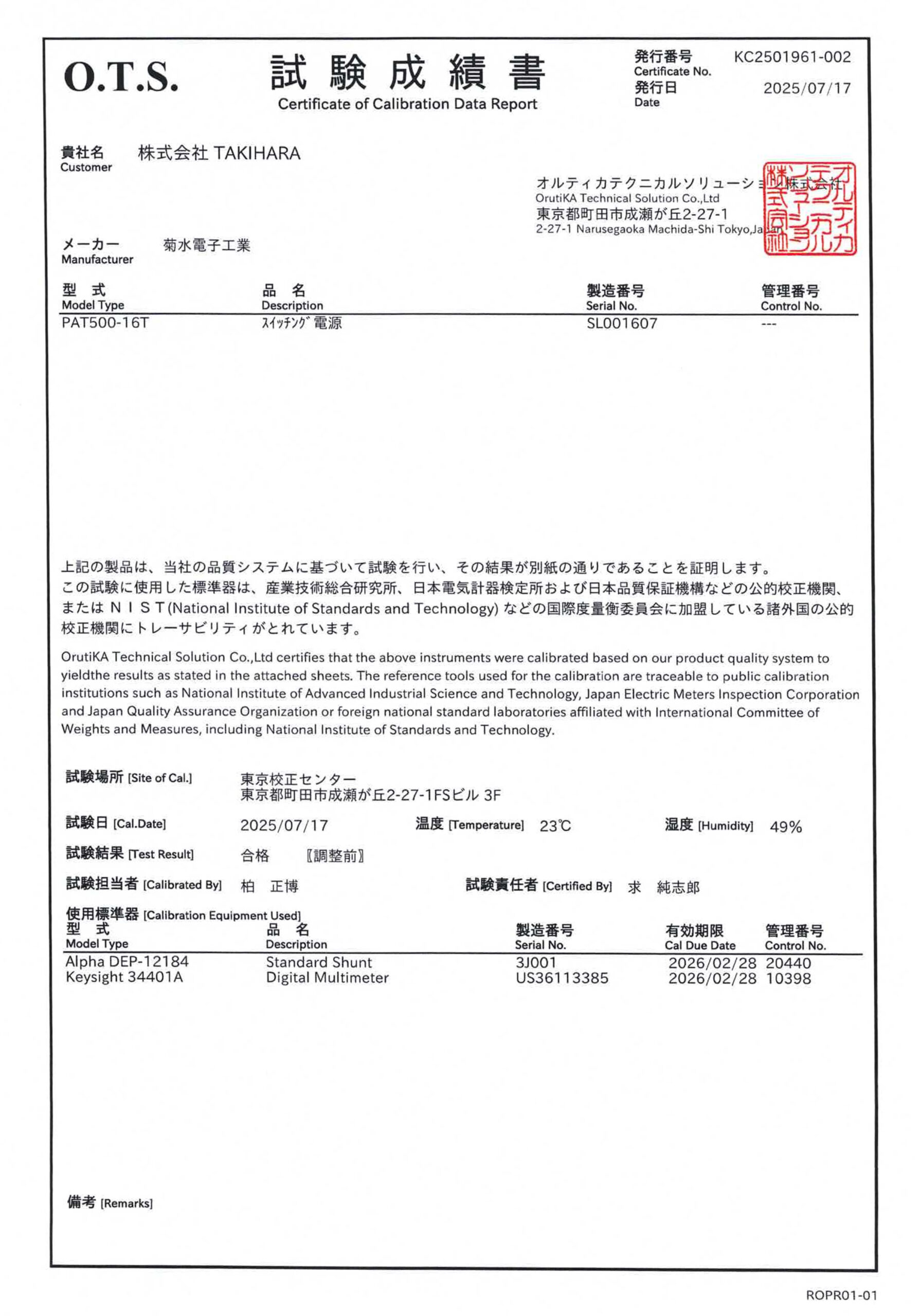 ・Calibration Test Report, Power Cable